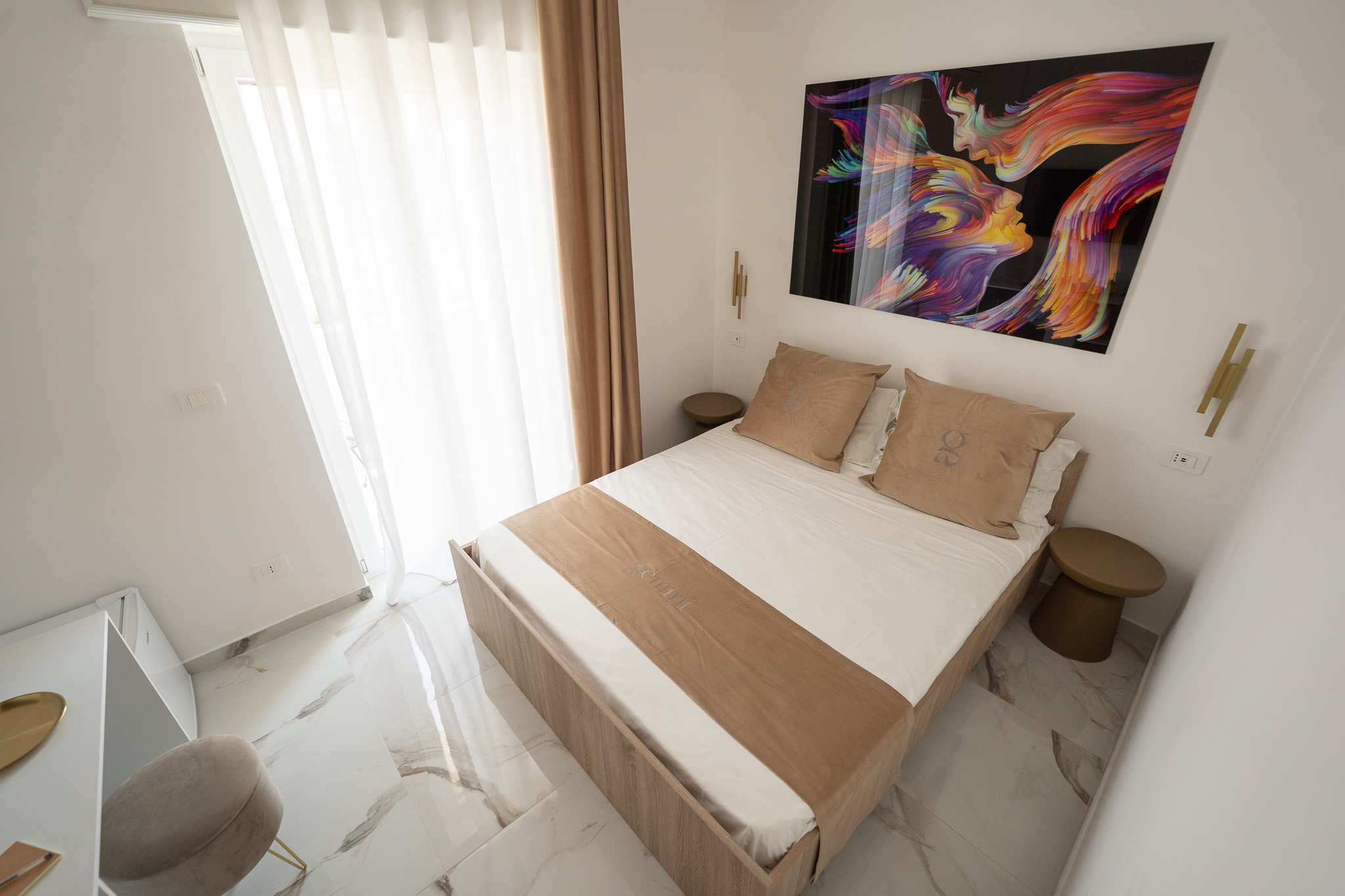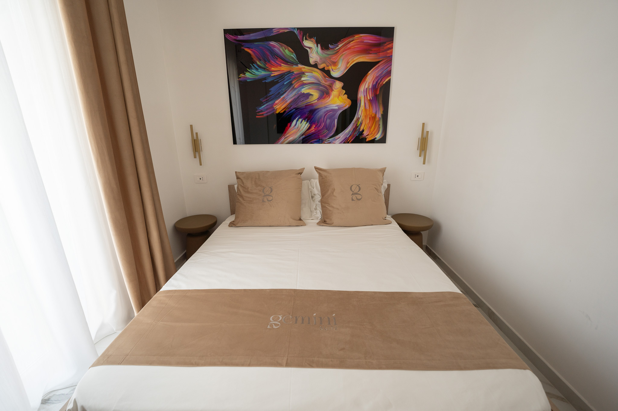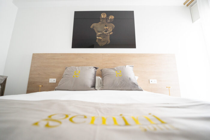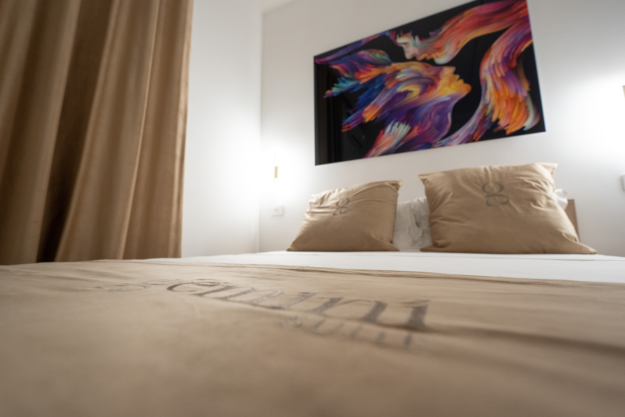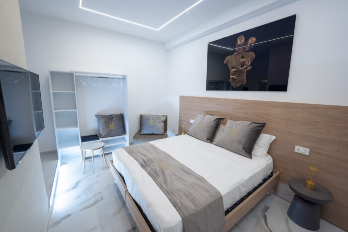 Benvenuti nella camera Aria suite, un’oasi di comfort e stile. Arredata con cuscini marrone chiaro che donano un tocco di eleganza al design contemporaneo, questa stanza offre un terrazzino privato per il vostro relax.