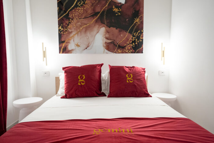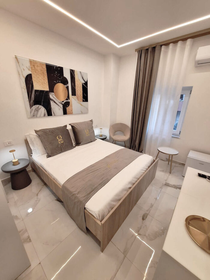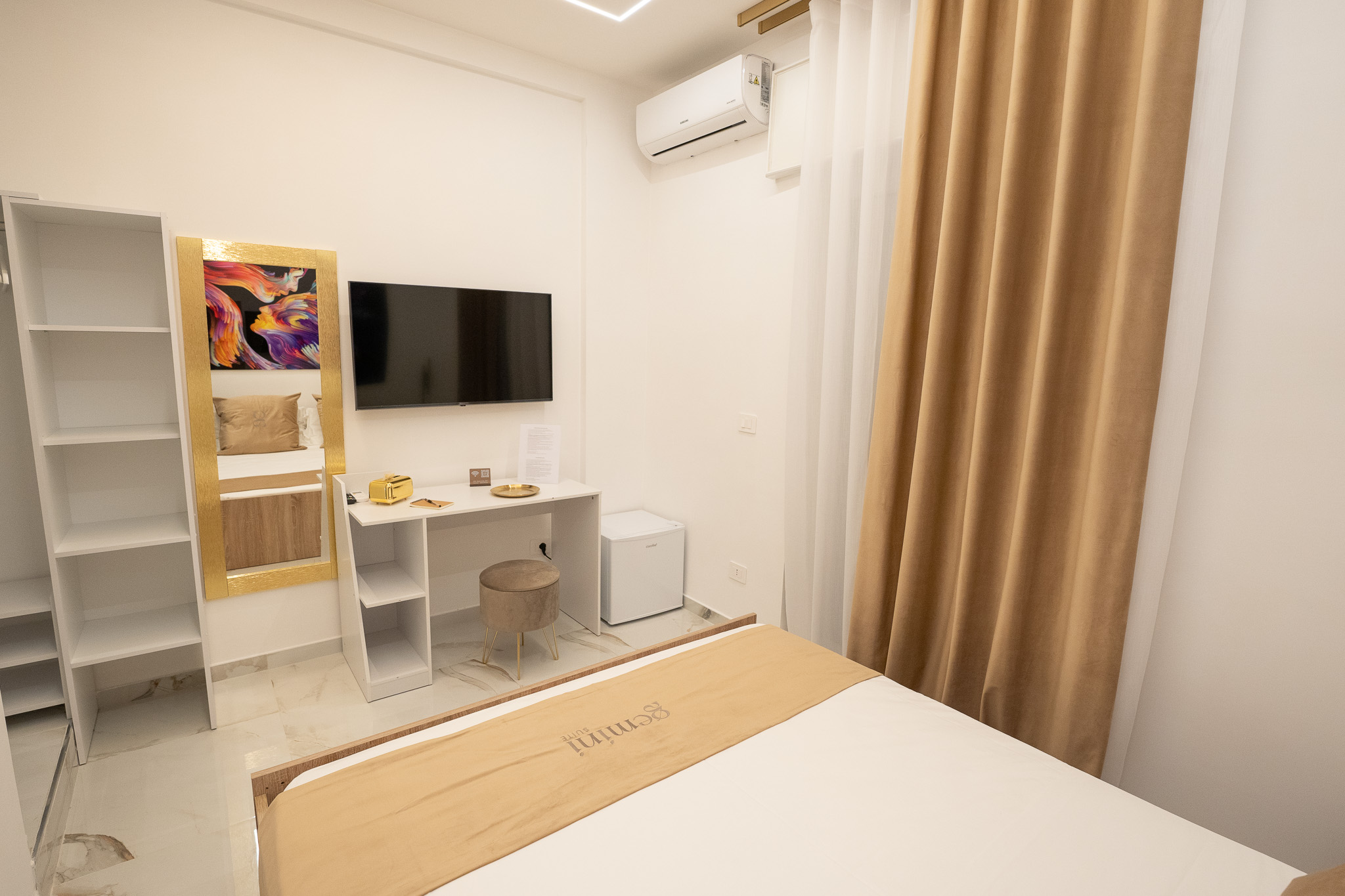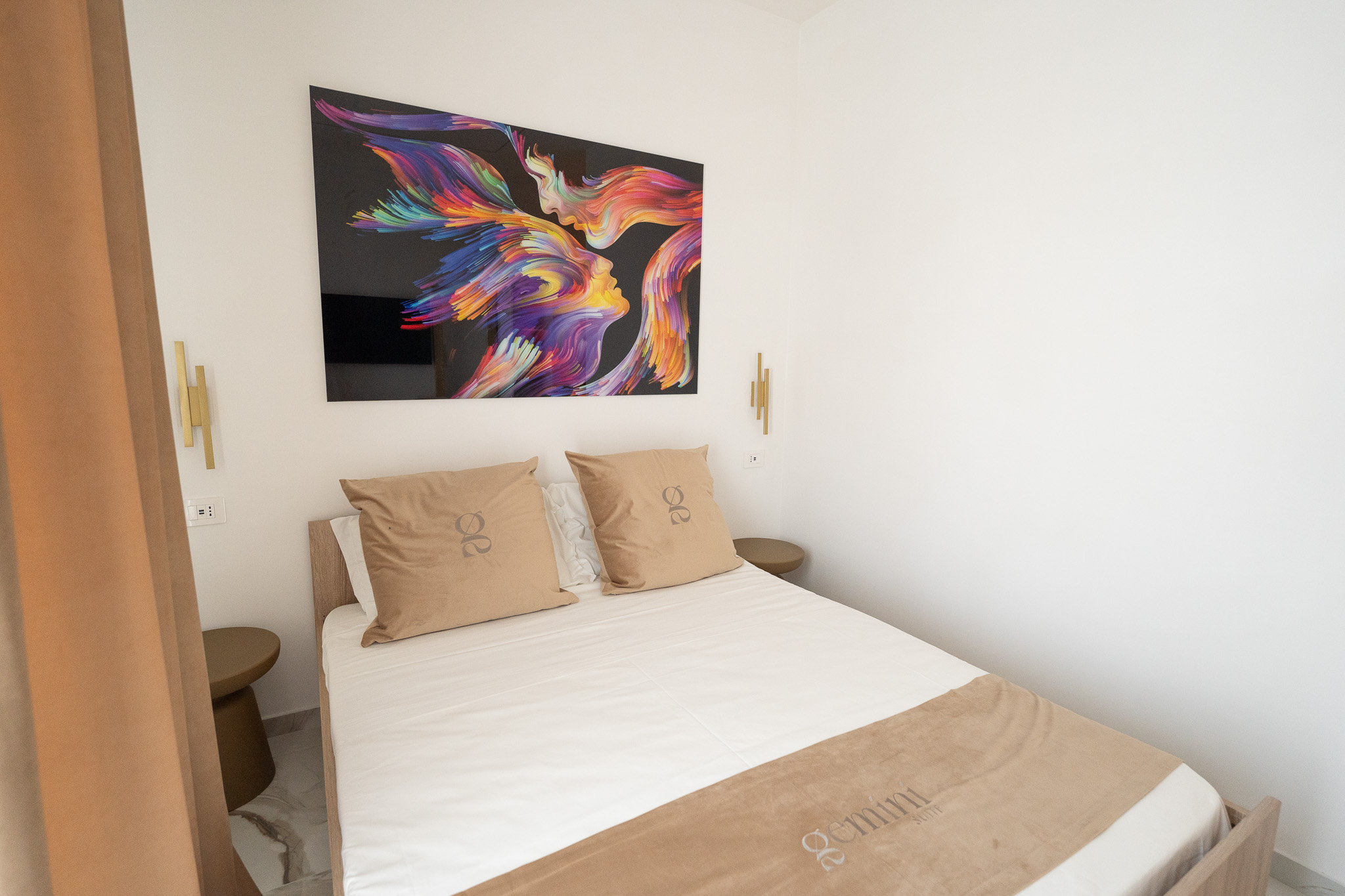 Benvenuti nella camera Aria suite, un’oasi di comfort e stile. Arredata con cuscini marrone chiaro che donano un tocco di eleganza al design contemporaneo, questa stanza offre un terrazzino privato per il vostro relax.